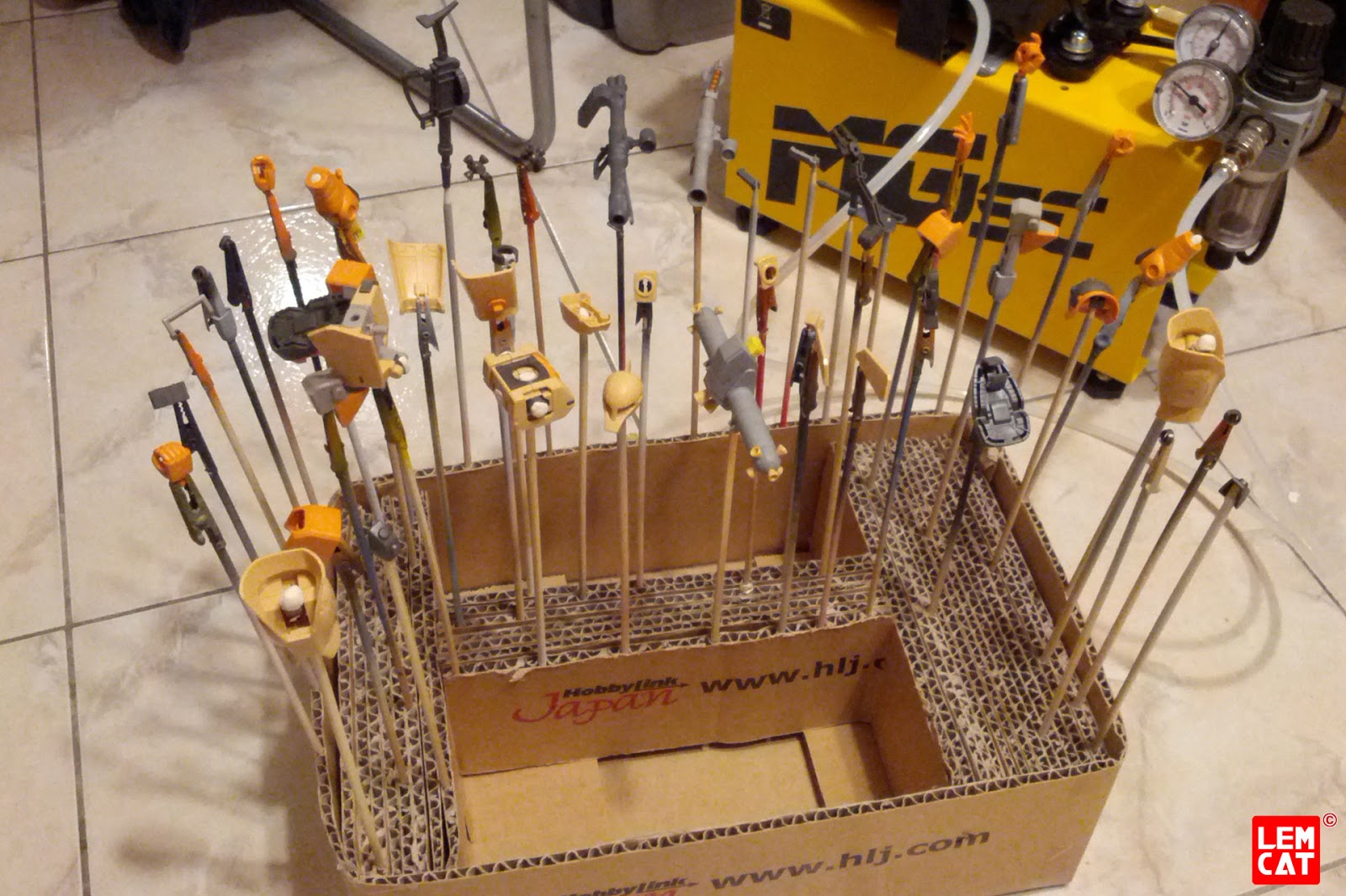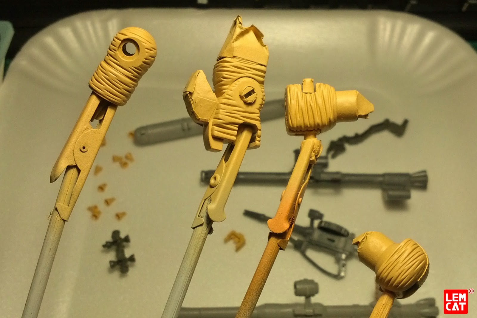 Mi sono costruito questi supporti per carteggiare le armi nei punti più stretti, peccato che dopo un po’ l’acqua ha inzuppato il legno e il nastro biadesivo non teneva più, prossima volta supporti di plexiglass (carteggio bagnando sempre la carta)
